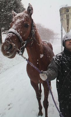 雪の中の引き運動は大変ですね。牧場の皆さんに感謝です。