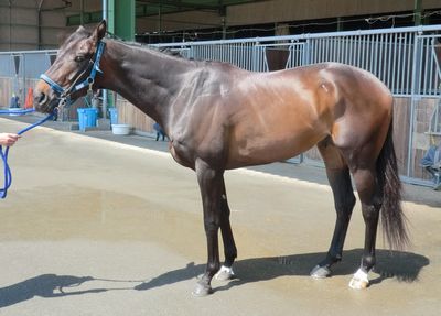 「球節部分の腫れに関しては、キッチリとケアをしましたので、しっかりと固まってきました。元々、歩様にも影響はなかったですし、馬自身気にする素振りもありませんでしたからね。こちらに関してはあまり心配はしていませんでした。むしろ全身の疲れの方が心配でしたが、こちらも1週間ウォーキングマシンで様子を見たところ、かなり回復してきました。背中の張りもほぐれてきましたし、歩様も硬さが抜けてスムーズになってきたんです。とにかく元気があり過ぎるくらいですから、その姿を見ていると疲れが取れてきたんだということが実感できます。昨日はウォーキングマシンの中で暴れて、左トモに擦り傷を作ってきたくらい元気一杯なんです。千田調教師もご覧になって、『当初はちょっと休ませるかなと思ったけど、もう大丈夫みたいだね。これならトレセンに戻すことも考えましょう』と、帰厩の予定を早める感じを匂わせていました」と話していました。