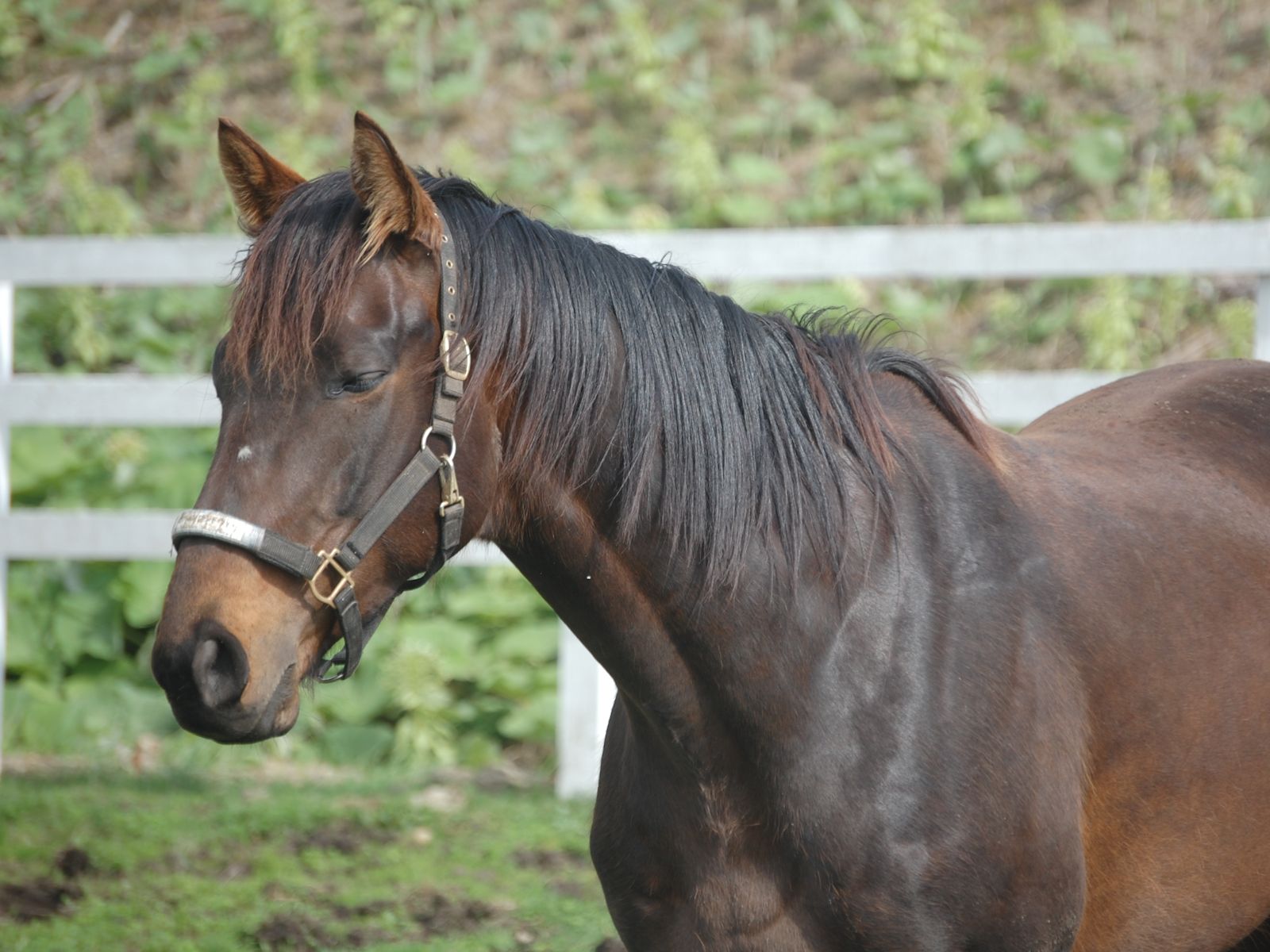 コスモヴューファームにて調整中。右前は中筋が太くなっていて腫れぼったく見える状況ですが、中身はエコー検査で良化が確認できています。今後見た目がスッキリすることはありませんので、この状況のまま進めていくことになります。ただ、まだ乗りを始める段階ではありませんので、最低でもあと1ヶ月はこの昼夜放牧のメニューで様子を見ます。馬体に関しては、カイバ食いも旺盛でかなりふっくらと見せているように、こちらへ来た当初よりおそらく30キロほどは増えているはずです。