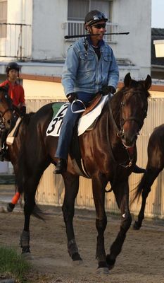 今朝も坂路を楽走で1本上がっていました。 「デビュー当初は自分から行こうという気持ちがなくて、どうしたもんかと思ったこともありました」と笑顔で昔を振り返る石坂調教師。それが今や準オープンでも逃げ切ってやろうかという馬に成長したのですから感慨深いものがあります。