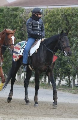 今朝は松原調教助手が騎乗して楽走に毛が生えた程度の馬なりを1本上がって軽いガス抜きを行っていました。 「順調だし、雰囲気にも貫録が出てきたので調整には苦労がありません」と、松原助手も余裕しゃくしゃくです。
