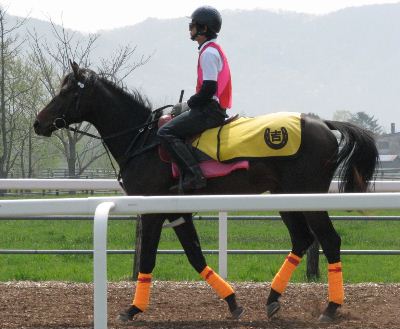 BTCに行き、ウォーキングマシン30分、屋外トラックコース、もしくは直線ダートコースにてキャンター2000m~2600m、または1000mの屋内坂路コースをキャンターにて2本、または坂路グラス馬場にてキャンター2400mを消化しています。