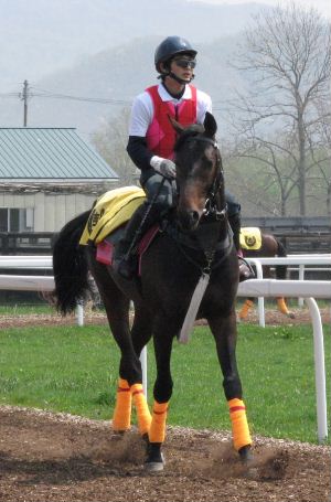 「馬運車、枠場でお尻にモノが触れても我慢が利くようになりましたから、先週ゲートをやってみたんです。後扉を閉めるその瞬間が緊張の瞬間だったのですが、少しカタカタしたくらいで、暴れるとか、ゲートを蹴るという仕草はありませんでした。まだ枠内静止をキッチリできる状況ではありませんが、まずは第一段階クリアですね。しかし、ビックリしたことがひとつ。後ろにモノが触れているのが嫌だからなのか、前扉を空けるとビュンと出て行ったんです。抜群のスタートでしたね。今後はあまり無理はさせずにゆっくり慣らしていってあげられればと思っています。馬体に関しては、元々見栄えのする好馬体だっただけに、急激な変化というのは感じませんが、最初のレベルが相当高い馬ですから、それ以上を望むのは酷でしょう。入厩はまだ先ですから、この夏はハロン15~15秒程度で基礎をみっちり鍛え上げていきます」と話していました。