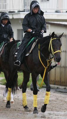 今朝の栗東TC馬場開場時間午前5時の気温27度、天候は曇り。南西からの風が強く吹きつけ、それがまた生温かくて爽やかとはほど遠い朝でした。これはどうやら雨の前兆だったようで、午後からは本格的な雨となっています。馬場状態は「良」でした。