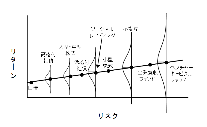 右に行くほど、リスクが高く、上に行くほどリターンが大きい。