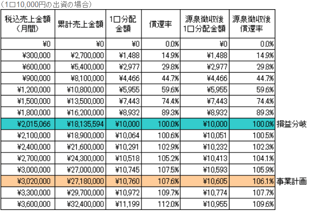 上記の表が「金銭による分配金額のシミュレーション」ですが、1月当たりの売り上げが「201.5万円」で「トントン」です。