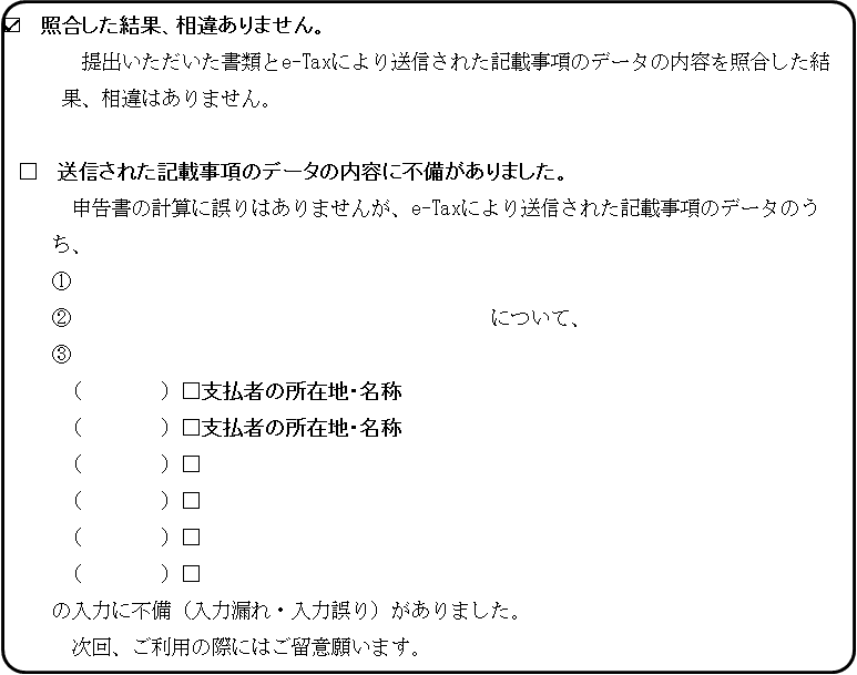 ☑ 照合した結果、相違ありません。 提出いただいた書類とe-Taxにより送信された記載事項のデータ